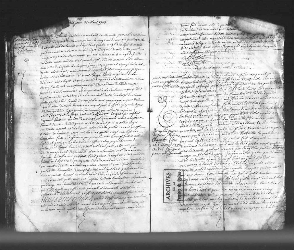 Ordonnance du lieutenant général civil et criminel de la Prévôté et Amirauté de Québec, qui renvoi les parties, François Plet, marchand de Paris, comparant par Lucien Bouteville, marchand bourgeois de Québec, demandeur, et Joseph Petit Bruneau, défendeur, hors de cour, 2 avril 1703, Archives nationales à Québec, Collection Pièces judiciaires et notariales, (03Q,TL5,D320-41).