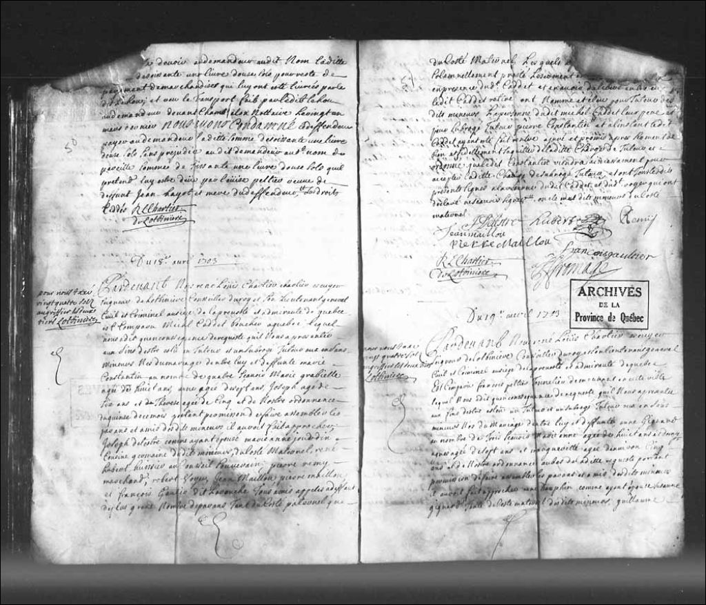 Acte de tutelle, délibérations et élections de Michel Cadet, boucher de Québec, comme tuteur de ses enfants mineurs issus de son mariage avec la défunte Marie Constantin, soit Marie Gabrielle, âgée de 8 ans, Anne, âgée de 7 ans, Joseph, âgé de 6 ans et Thérèse, âgée de 5 ans, et Pierre Constantin, comme subrogé tuteur, 18 avril 1703, Archives nationales à Québec, Collection Pièces judiciaires et notariales, (03Q,TL5,D320-53).