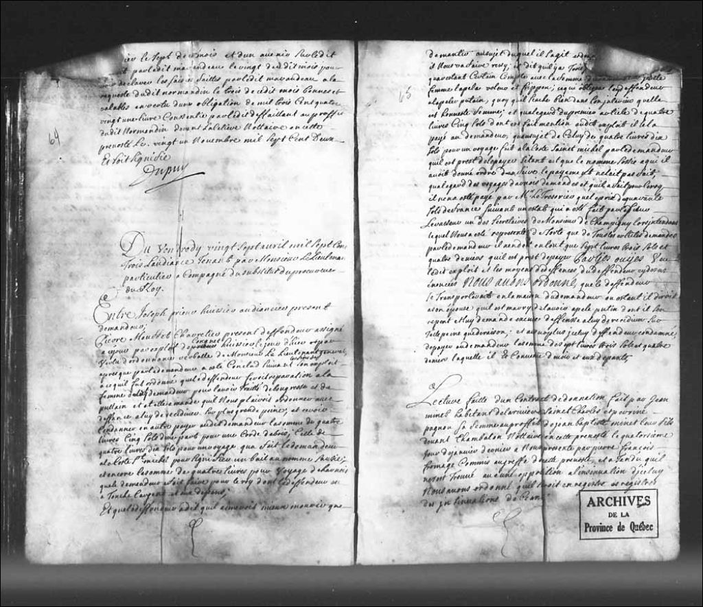 Enregistrement au registre des insinuations de la Prévôté de Québec, d'un contrat de donation, fait par Jean Minet, habitant de la rivière Saint-Charles et Perrine Pagnoux, sa femme au profit de Jean-Baptiste Minet, leur fils, devant Louis Chambalon, notaire en cette Prévôté, le 14 janvier 1703, 27 avril 1703, Archives nationales à Québec, Collection Pièces judiciaires et notariales, (03Q,TL5,D320-83).