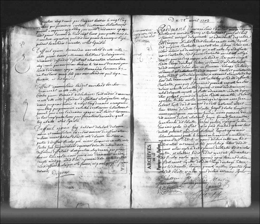Défaut à Ignace Guay, habitant de la côte de Lauzon (Lauson), au nom et comme tuteur des enfants mineurs de défunt Étienne Rocheron, vivant habitant de la côte de Lauzon, héritiers en partie de défunt Nicolas Pré, vivant armurier de Québec, contre Jean Jung, marchand de la ville de Bordeaux, défendeur et défaillant à l'assignation donnée par Prieur, huissier, le 19 avril 1703, pour se voir condamner à rendre compte audit Guay, audit nom, du revenu de la vente des effets dudit défunt Nicolas Pré et sa femme; et pour le profit, permission de saisie