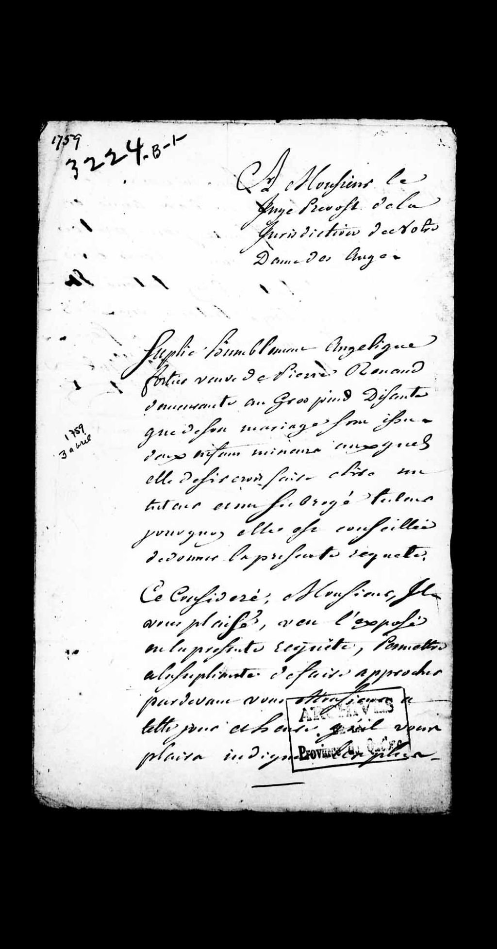 Requête de Angélique Fortier, demeurant au Gros-Pin, veuve de Pierre Renaud, demandant la permission de faire comparaître les parents et amis des enfants mineurs issus de son mariage avec le défunt Renaud, dans le but de faire élire un tuteur pour lesdits enfants mineurs, 3 avril 1759, Archives nationales à Québec, Collection Pièces judiciaires et notariales, (03Q,TL5,D3224-2).