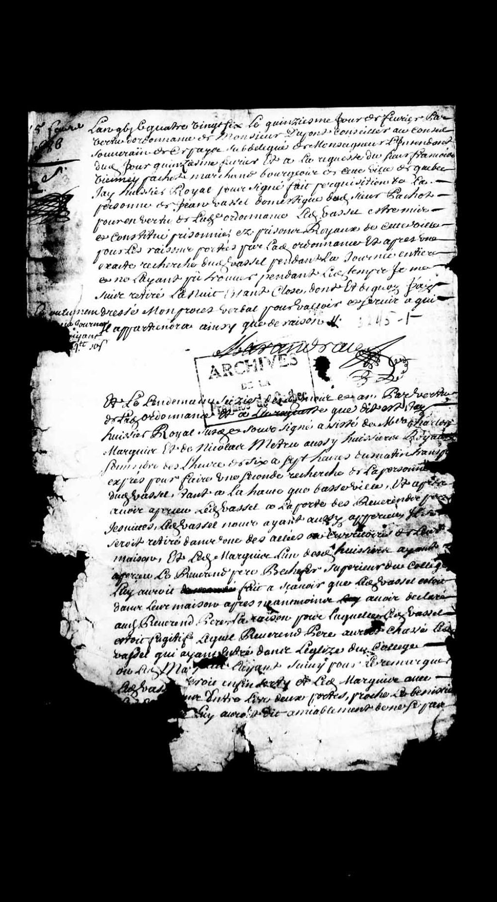 Dossier en matières civiles reçu par la Prévôté de Québec. Ce dossier comprend la requête de François Viennay-Pachot, ainsi que le procès-verbal de l'arrestation de Jean Vassel