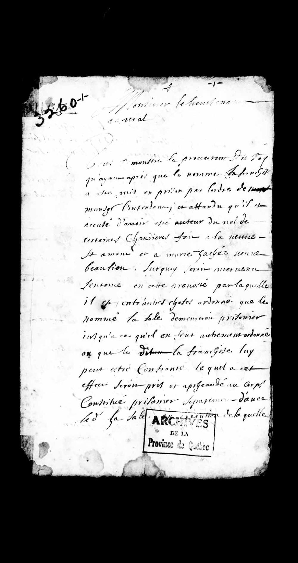 Requête de procureur du Roi au sujet de l'emprisonnement du nommé Lafranchise, suite à un vol de chaudières commis chez la veuve Saint-Amant et chez Marie Zachée (Jachée), veuve Beaulieu, par le nommé Lasalle, également emprisonné; demandant l'autorisation de procéder à l'interrogatoire dudit Lafranchise, 12 décembre 1695, Archives nationales à Québec, Collection Pièces judiciaires et notariales, (03Q,TL5,D3260).