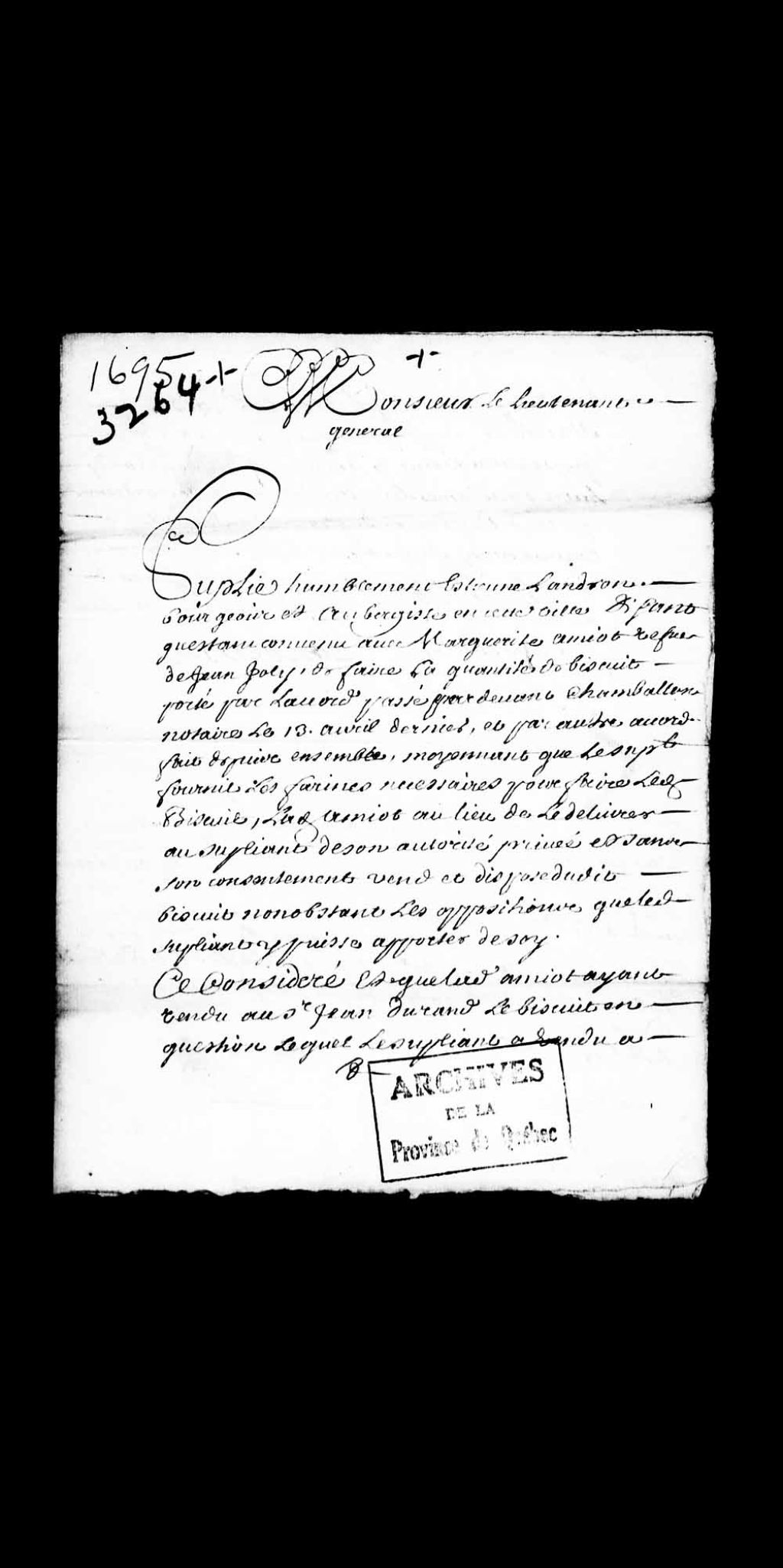 Requête de Etienne Landron (Landeron), bourgeois et aubergiste de Québec, dans son instance avec Marguerite Amiot, veuve de Jean Joly, concernant le non respect d'un accord, passé le 13 avril 1695, devant le sieur Chambalon, notaire, relativement à la confection d'une quantité de biscuits; demandant l'assignation de ladite Amiot à délivrer au suppliant lesdits biscuits