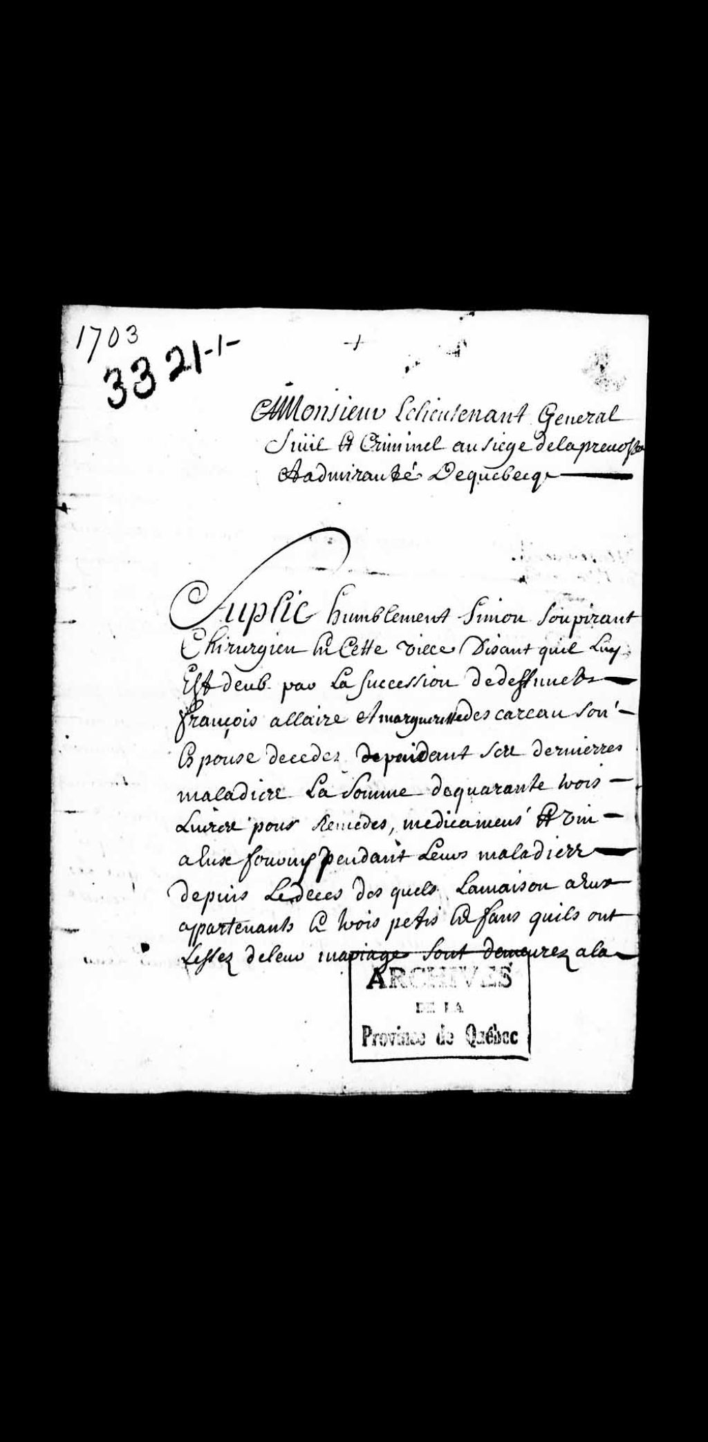 Requête de Simon Soupiran (Soupirant), maître chirurgien de la ville de Québec, pour élection de tuteur aux enfants du défunt François Allaire et de feu Marguerite Ducarreau, dans l'optique de se faire rembourser les frais médicaux encourus lors des maladies desdits défunts, 17 mars 1703, Archives nationales à Québec, Collection Pièces judiciaires et notariales, (03Q,TL5,D3321).