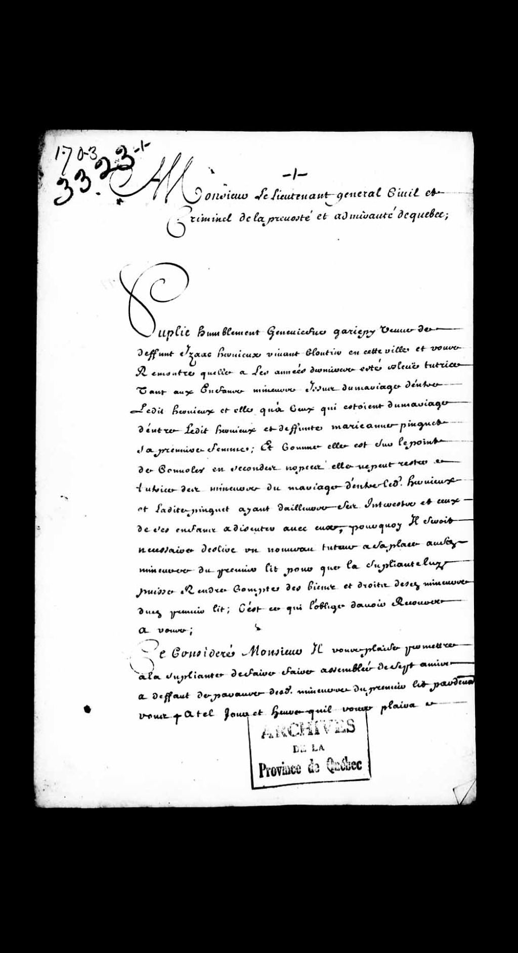 Requête de Geneviève Gariépy pour élection de tuteur pour les enfants mineurs issus de son union avec feu Isaac Hervieux, cloutier de Québec, mais également pour les enfants nés du premier mariage du défunt avec feu Marie-Anne Pinguet; cette requête étant rendue nécessaire en vertu du mariage prochain de Geneviève Gariépy, 13 mars 1703, Archives nationales à Québec, Collection Pièces judiciaires et notariales, (03Q,TL5,D3323).