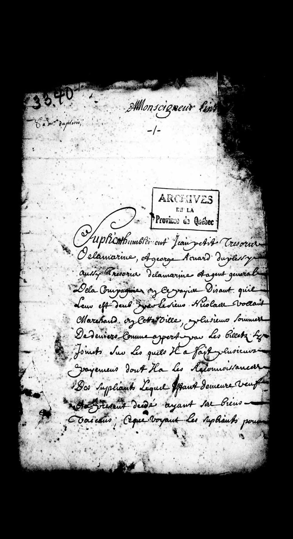 - Requête de Jean Petit, trésorier de la Marine, et Georges Regnard Duplessis, trésorier de la Marine, au sujet de la pose d'un scellé sur la communauté de biens du défunt Nicolas Volant, marchand