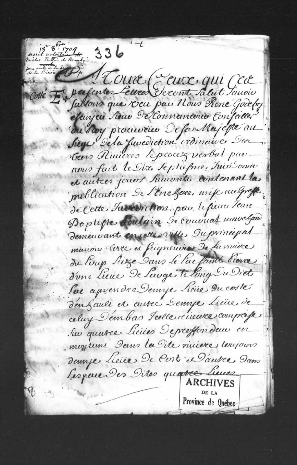 Décret volontaire de Michel Trottier de Beaubien, seigneur, pour la vente de la seigneurie de la Rivière-du-Loup, sur le lac Saint-Pierre, 18 octobre 1704, Archives nationales à Québec, Collection Pièces judiciaires et notariales, (03Q,TL5,D336).