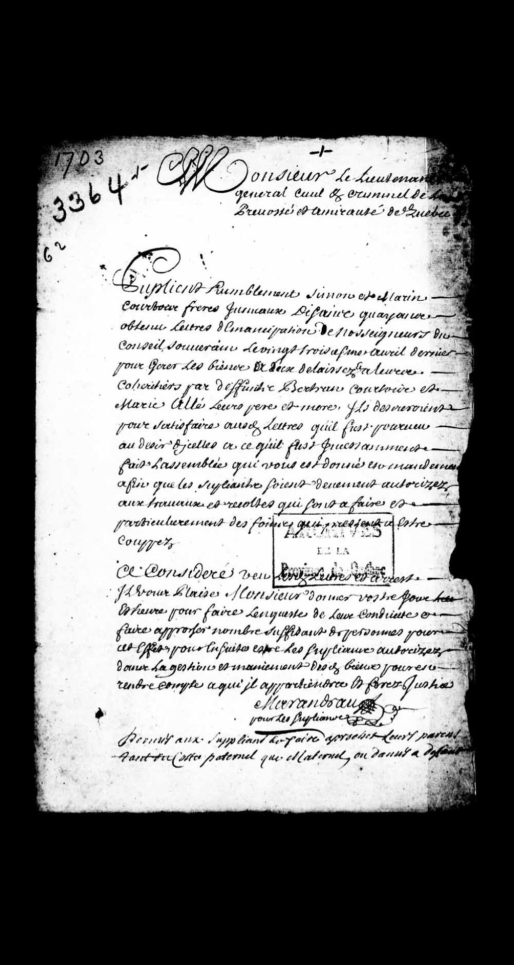 Requête de Simon et Marin Courtois, frères jumeaux, suite à l'obtention d'une lettre d'émancipation de nos seigneurs du Conseil souverain le 23 avril dernier 1703, demandant l'inventaire des biens des défunts Bernard Courtois et Marie Hallé (Allé), leur père et mère, pour ainsi pouvoir s'occuper des récoltes et des foins