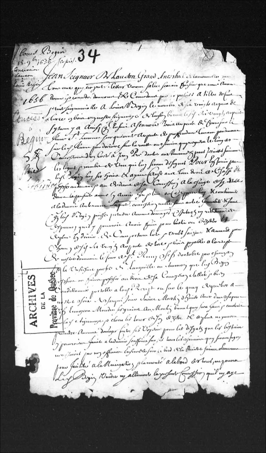 Concession de 120 arpents de terre par Jean de Lauson, grand sénéchal de la Nouvelle-France (gouverneur) à Louis Bégin, en la seigneurie de Lauzon