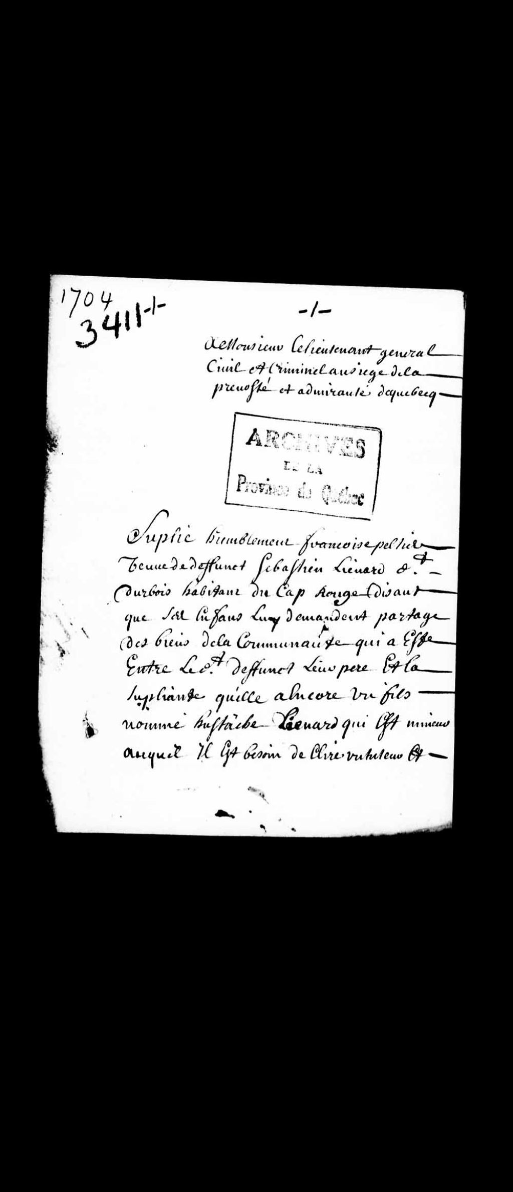 Requête de Françoise Pelletier, veuve du défunt Sébastien Liénard dit Durbois, habitant du Cap-Rouge, demandant élection de tuteur à son fils mineur suite à la volonté des autres enfants d'effectuer le partage de la communauté de biens, 29 avril 1704, Archives nationales à Québec, Collection Pièces judiciaires et notariales, (03Q,TL5,D3411).