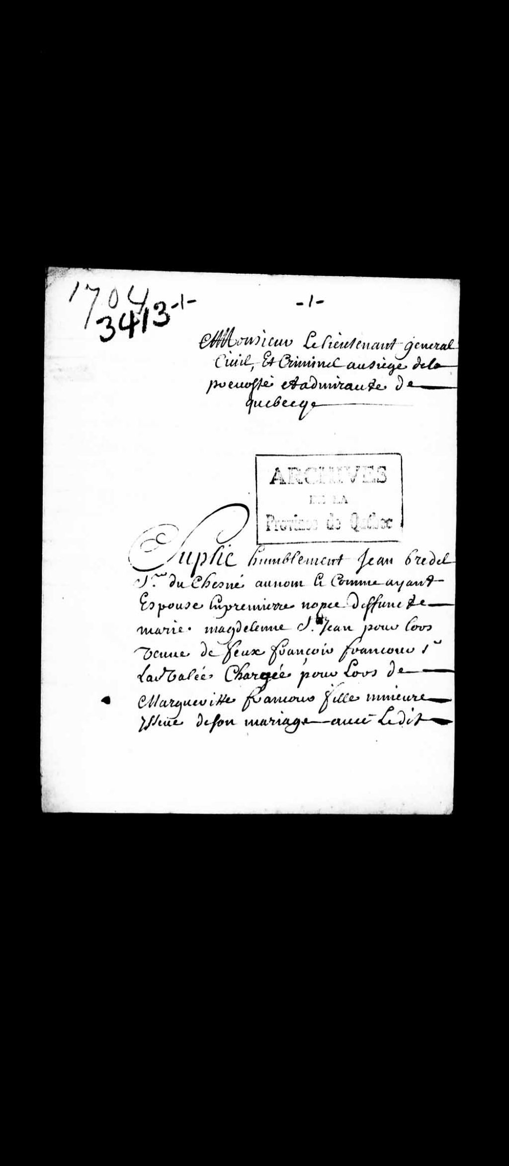 Requête de Jean Bredel sieur Duchesnay, au nom et comme ayant épousé en premières noces feu Marie-Madeleine Saint-Jean, veuve de François Francoeur dit Lavallée, pour élection de tuteur et de subrogé tuteur à la fille mineure issue du mariage entre ledit Francoeur et ladite Saint-Jean, 18 avril 1704, Archives nationales à Québec, Collection Pièces judiciaires et notariales, (03Q,TL5,D3413).
