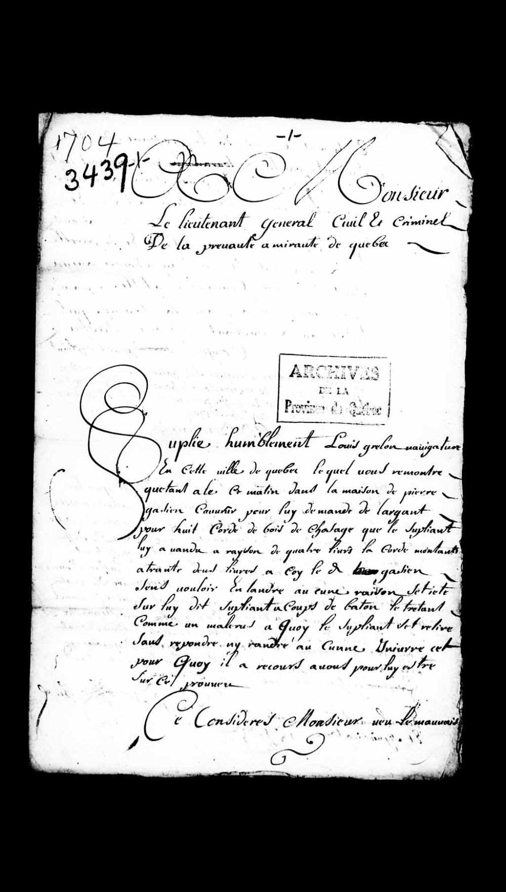 Requête de Louis Greslon, navigateur de Québec, contre Pierre Gatien, maître couvreur, au sujet d'une agression à coups de bâton et d'injures, et d'une somme due suite à la vente de huit cordes de bois de chauffage, 26 août 1704, Archives nationales à Québec, Collection Pièces judiciaires et notariales, (03Q,TL5,D3439).