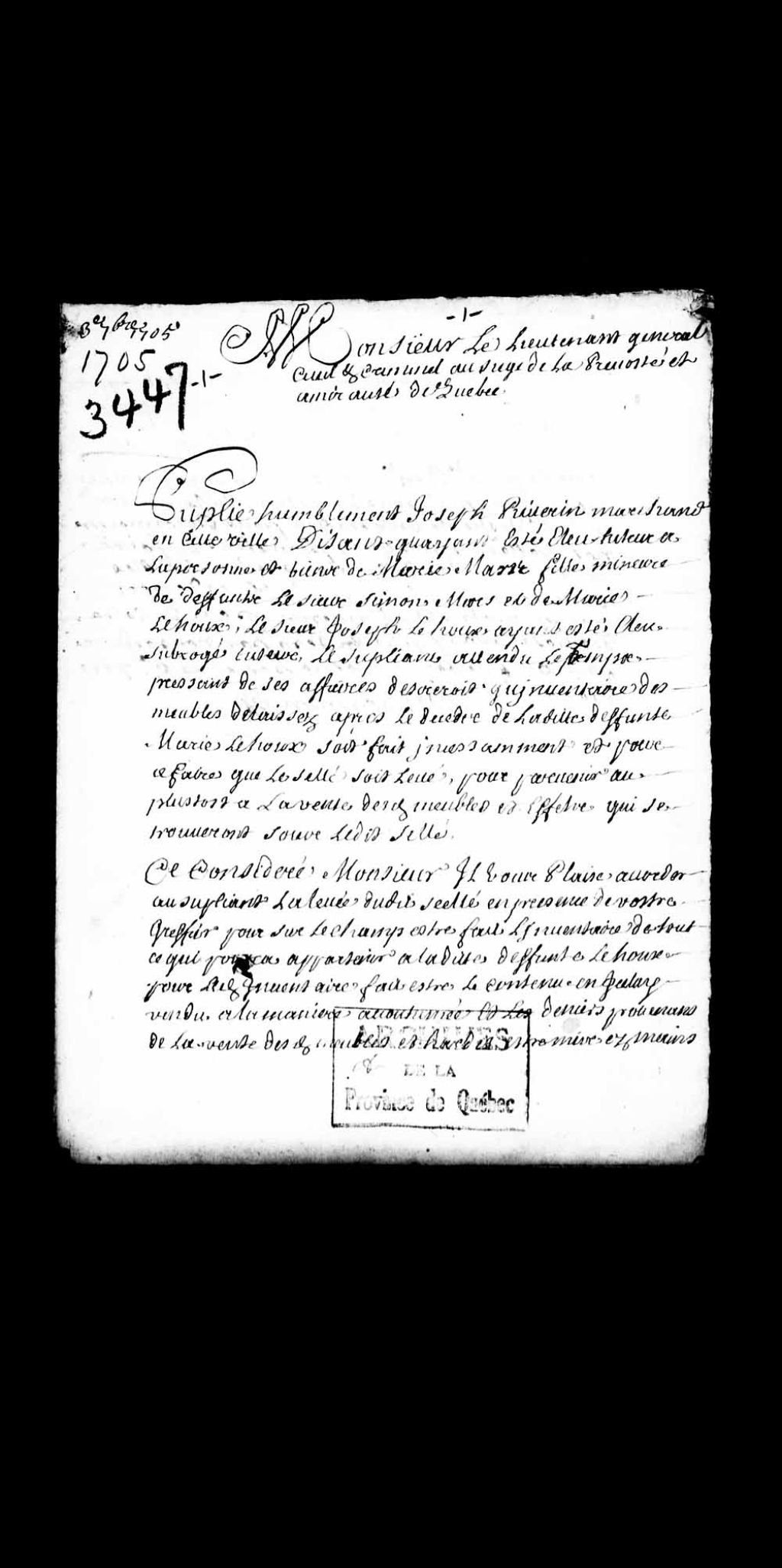 Requête de Joseph Riverin, marchand de la ville de Québec, demandant la levée des scellés sur les effets de Marie Mars, fille mineure du défunt sieur Simon Mars et de Marie Lehoux, pour procéder à l'inventaire de la communauté des biens et à la vente de ces biens meubles pour remboursement des dettes, notamment celles liées aux frais funéraires et autres dépenses, 3 septembre 1705, Archives nationales à Québec, Collection Pièces judiciaires et notariales, (03Q,TL5,D3447).