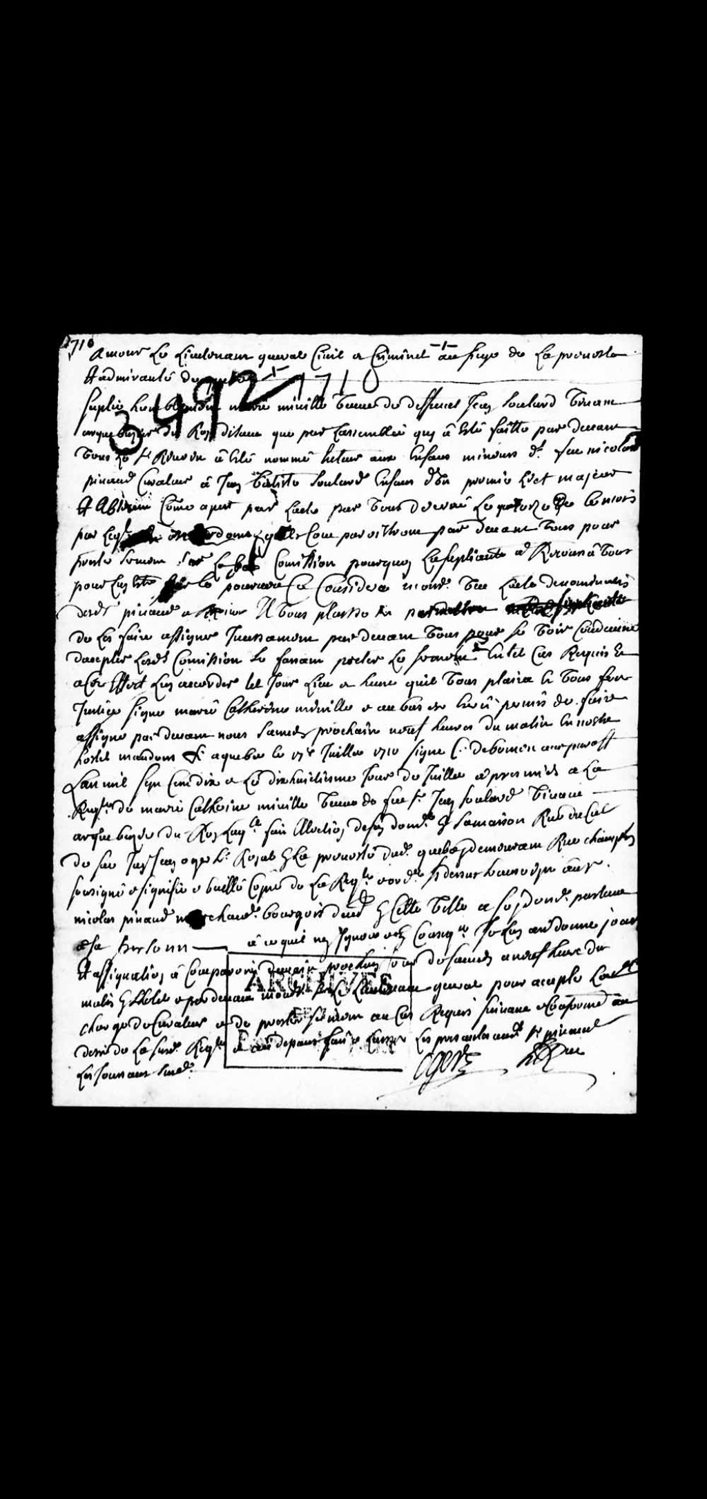 Requête de Marie-Catherine Minville, veuve du défunt Jean Soulard, arquebusier du Roi, demandant l'assermentation de Nicolas Pinaud, marchand bourgeois de la ville de Québec, curateur de Jean-Baptiste Soulard, enfant majeur, en premières noces, dudit feu Soulard, 17 juillet 1710, Archives nationales à Québec, Collection Pièces judiciaires et notariales, (03Q,TL5,D3492).