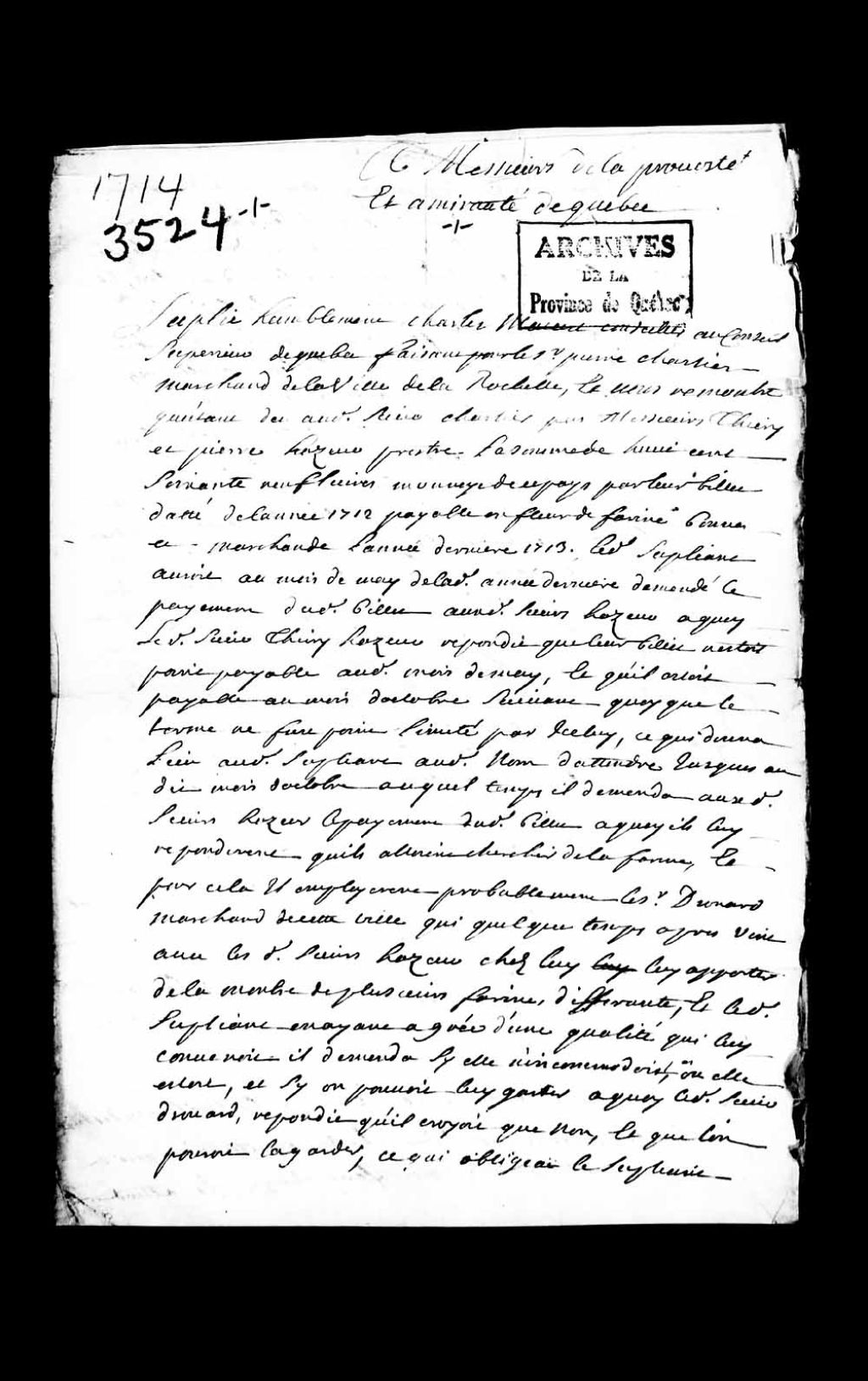 Requête de Charles Macard, conseiller au Conseil supérieur de Québec, en son nom et comme procureur pour Pierre Chartier, marchand de la ville de La Rochelle, demandant que les sieurs Thierry Hazeur et Pierre Hazeur, prêtres, soient condamnés à livrer des fleurs de farine au suppliant, à raison de 20 livres le cent jusqu'à concurrence de 869 livres, 9 octobre 1714, Archives nationales à Québec, Collection Pièces judiciaires et notariales, (03Q,TL5,D3524).