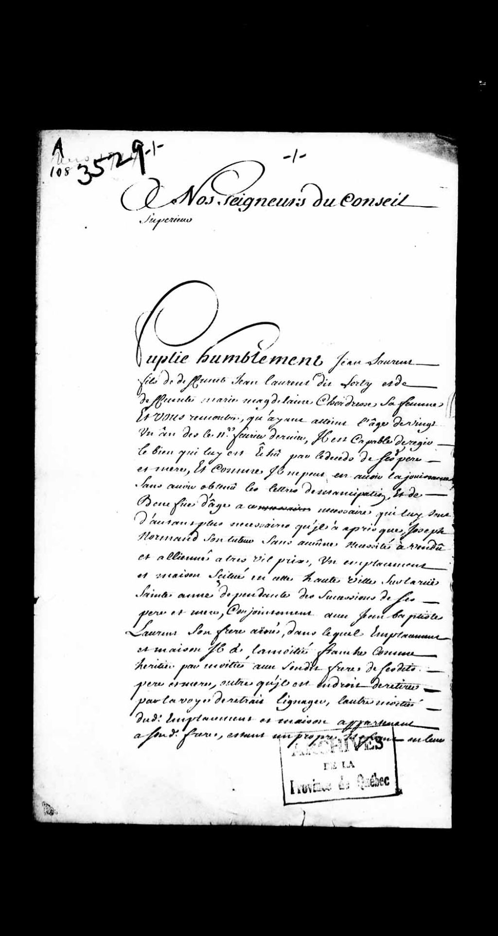 Requête de Jean Laurent, fils de défunt Jean Laurent dit Lortie et de feue Marie-Madeleine Chardon, pour l'obtention de lettres d'émancipation et de bénéfice d'âge, nécessaires pour régir et administrer ses biens sous l'autorité d'un curateur, [avant le 15 mai 1713], Archives nationales à Québec, Collection Pièces judiciaires et notariales, (03Q,TL5,D3529).