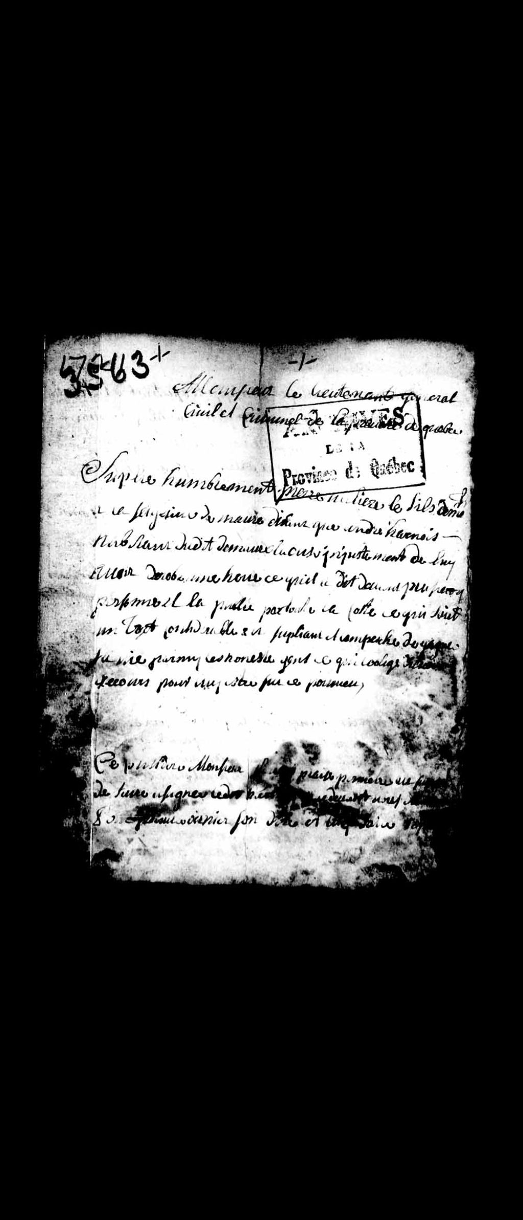 - Dossier en matières civiles reçu par la Prévôté de Québec. Ce dossier comprend la requête de Pierre Vallière, ainsi qu'une procuration de Pierre Vallière à sa femme, Marguerite Gaboury
