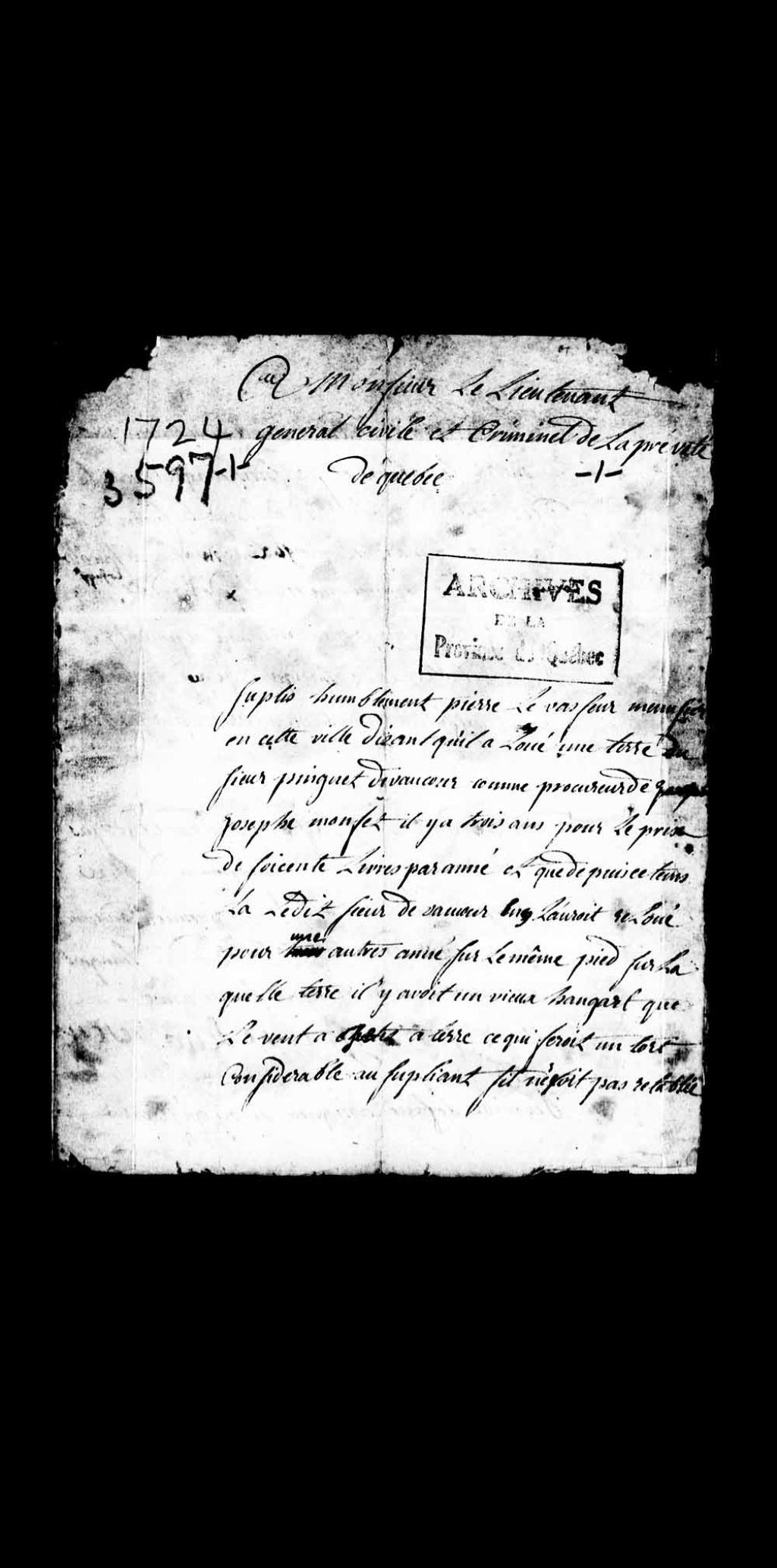 Requête de Pierre Levasseur, menuisier de la ville de Québec, demandant d'assigner le sieur Pinguet de Vaucour, comme procureur de Josephe Monfet (Maufay - Maufaix), pour le condamner à rétablir le hangar situé sur la terre louée par Pierre Levasseur; ledit hangar ayant été jeté à terre par le vent, empêchant ainsi le suppliant d'entreposer les foins et les grains, 6 juillet 1724, Archives nationales à Québec, Collection Pièces judiciaires et notariales, (03Q,TL5,D3597).