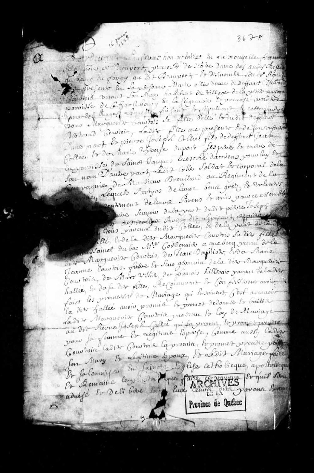 - Ce dossier en matières civiles provient de la Prévôté de Québec et du Conseil supérieur de Québec. Il comprend un extrait d'un contrat de mariage entre Marguerite Courtois, fille Bertrand Courtois, habitant du village de la Petite Auvergne, paroisse de Charlesbourg, en la seigneurie de Notre-Dame-des-Anges, et Marie Halay (Hallé), d'une part, et Pierre Joseph Collé (Collet), fils de défunt Jean Collé et de Marie Thérèse Dupont (acte de Paul Vachon, notaire de la seigneurie de Beauport, Prévôté de Notre-Dame-des-Anges, bourg de Fargy à Beauport, le 15 janvier 1688); des requêtes adressées à la Prévôté par Joseph Collet, habitant de Saint-Romain; une estimation demandée par Marie Halay, femme de Bertrand Courtois; la signification d'une sentence; d'autres estimations des terres appartenant à la succession Courtois; un inventaire des pièces produites à la Prévôté par les parties; une requête adressée au Conseil souverain de Québec par Simon et Marin Courtois qui demandent un appel; un extrait des registres du Conseil souverain de Québec; une requête de Joseph Collet, adressée elle aussi au Conseil; l'enquête faite par Bermen de la Martinière, lieutenant général civil et criminel de la Prévôté de Québec; les réponses des parties; l'ordonnance de la Prévôté de Québec