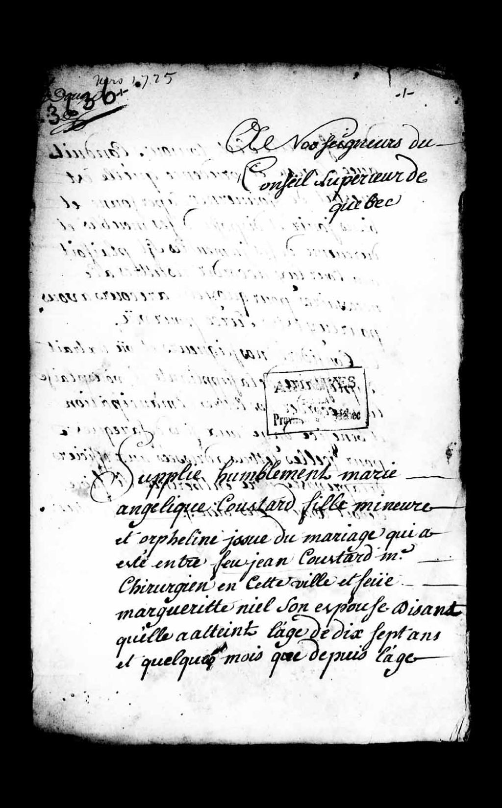 Requête de Marie-Angélique Coutard (Coustard), fille mineure et orpheline de feu Jean Coutard (Coustard), maître chirurgien, et de feu Marguerite Niel, pour l'obtention de lettres d'émancipation et de bénéfice d'âge, nécessaires pour jouir et disposer de ses biens meubles, [avant le 1er juillet 1726], Archives nationales à Québec, Collection Pièces judiciaires et notariales, (03Q,TL5,D3636).