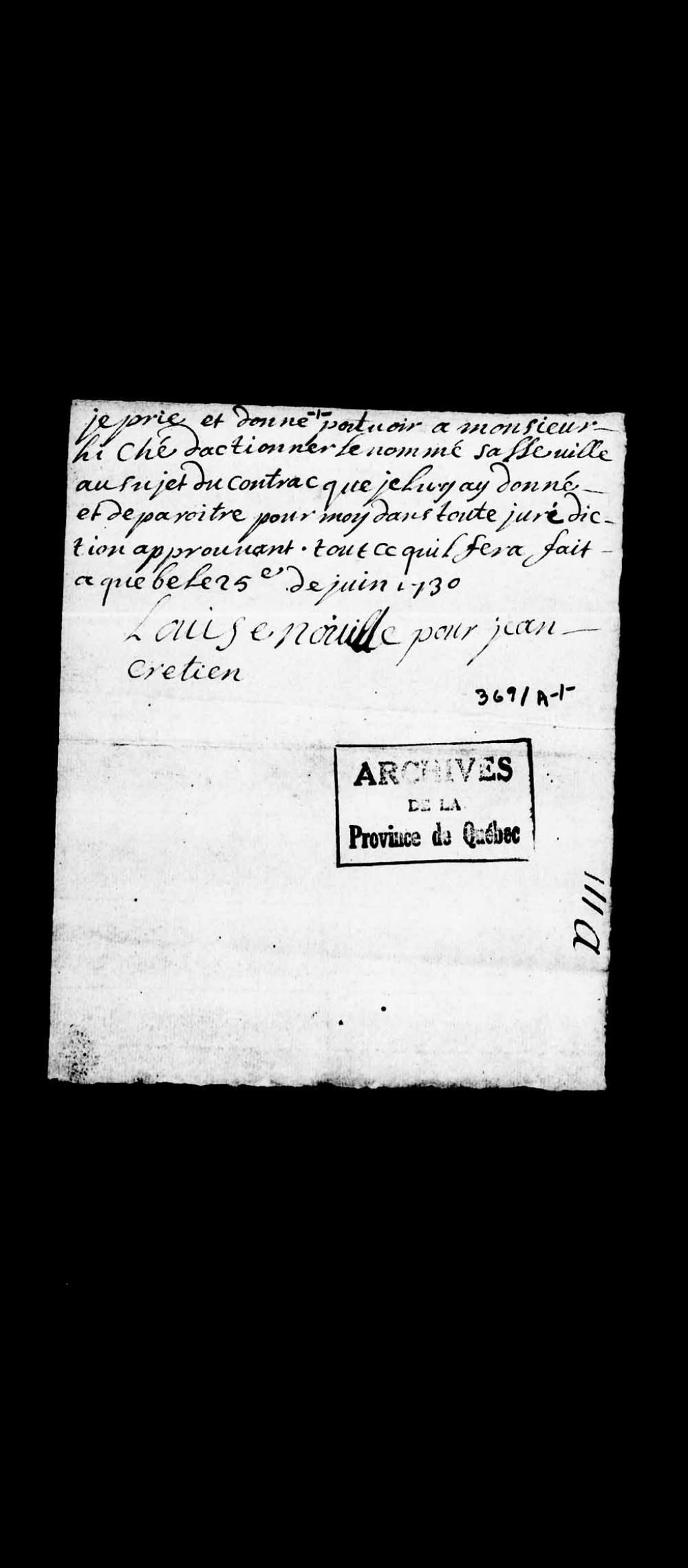 Procédures entre Jean Chrétien, demeurant à Saint-Romain, côte de Charlesbourg, et Pierre Sasseville, habitant de la côte Saint-Bernard, et Madeleine Jobin, sa femme, au sujet du contrat de vente, passé le 24 novembre 1721 devant feu maître de la Cetière, notaire royal de la prévôté de Québec, concernant une terre et une habitation située en la seigneurie de Saint-Gabriel, appartenant aux dames religieuses de l'Hôtel-Dieu de Québec, achetée par ledit Chrétien à Pierre Sasseville; ledit Chrétien demandant que ledit Sasseville et sa femme soient condamnés à payer la somme de 200 livres due à la succession du défunt sieur Minet, étant donné que ledit contrat stipulait que la terre était exempte de toutes dettes et hypothèques