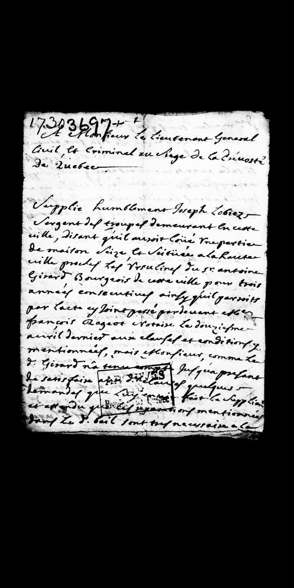 Requête de Joseph Loubier (Loubiez), sergent des troupes, demeurant à Québec, à l'effet qu'il aurait loué pour trois années consécutives une partie d'une maison, située à la Haute-Ville, près des Ursulines, au sieur Antoine Girard, bourgeois de Québec, et que ledit Girard n'a pas effectué l'entretien et les réparations, tel que stipulé dans les clauses du bail fait devant François Rageot, notaire, le 12 avril 1730; demandant la condamnation dudit Girard à effectuer lesdites réparations, 18 octobre 1730, Archives nationales à Québec, Collection Pièces judiciaires et notariales, (03Q,TL5,D3697).