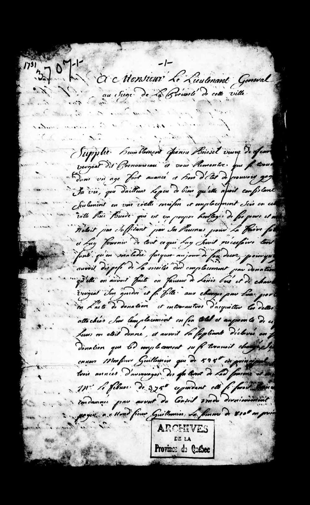 Requête de Jeanne Boissel, veuve de Jean Vergeat dit Prenouveau, demandant que ces enfants soient condamnés à prendre immédiatement la moitié d'une habitation, située rue Buade, et par le fait même, obligés d'acquitter les dettes dont elle est chargée, ou, qu'ils acceptent que ledit emplacement soit vendu par la suppliante pour acquitter les dettes envers les sieurs Lefebvre et Guillemin (Guillimin), 1er décembre 1731, Archives nationales à Québec, Collection Pièces judiciaires et notariales, (03Q,TL5,D3707).
