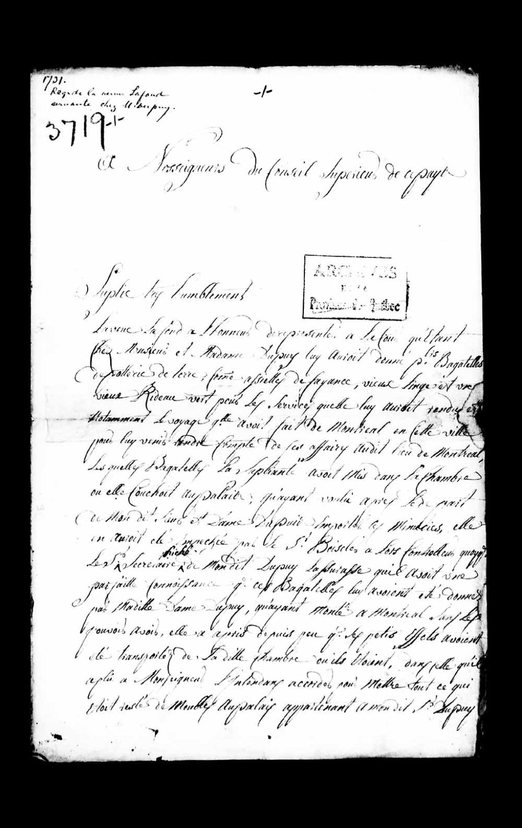 Requête de la veuve Lafond, servante chez Monsieur et Madame Dupuy (Dupuis), demandant la restitution de diverses bagatelles, soit de la poterie de terre, des assiettes de faïence, des vieux linges, des vieux rideau, reçues en considération des services rendus auxdits Dupuy; lesdites marchandises lui ayant été confisquées par le sieur Boisclerc, 7 mai 1731, Archives nationales à Québec, Collection Pièces judiciaires et notariales, (03Q,TL5,D3719).