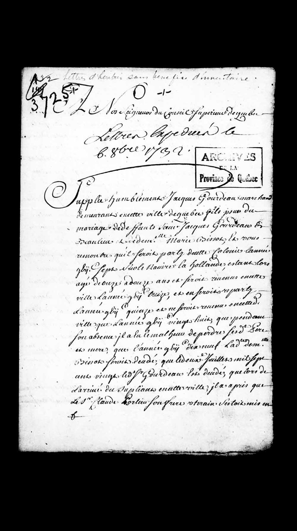 Requête de Jacques Gourdeau, marchand de Québec, fils de défunt sieur Jacques Gourdeau, sieur de Beaulieu, et de feue Marie Bissot, demandant des lettres d'héritier sous bénéfice d'inventaire dudit feu Gourdeau, son père; permettant au suppliant de prendre connaissance de l'état des biens, pour ainsi prendre la qualité d'héritier pur et simple, ou telles autres qualités qui lui seront les plus avantageuses et convenables, pour la conservation de ses droits et prétentions sur ladite succession