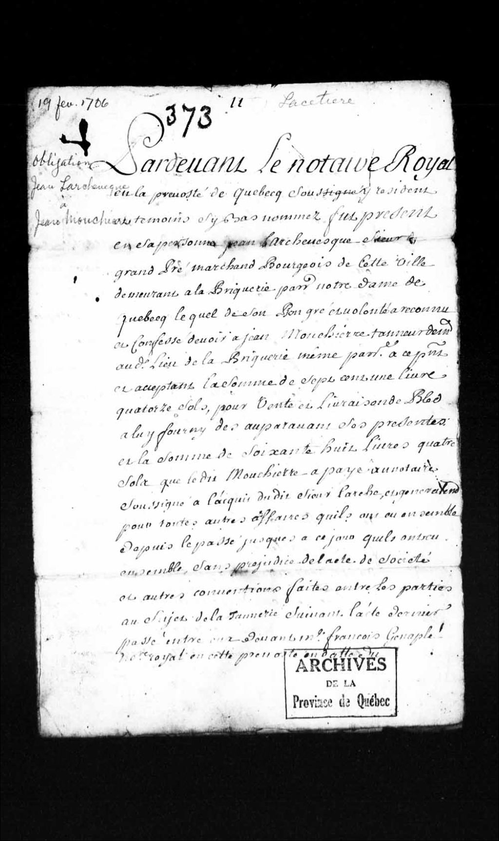 - Obligation de Jean Larchevêque, sieur de Grandpré, marchand bourgeois de Québec, demeurant à la Briqueterie, paroisse de Notre-Dame de Québec, à Jean Mouchière, tanneur, demeurant au même lieu