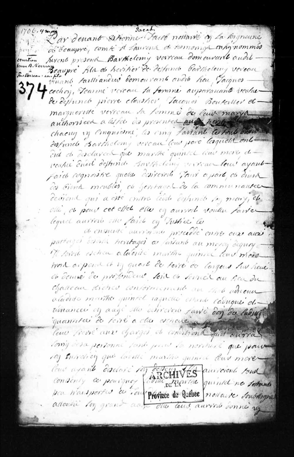 Partage entre les héritiers de Barthélemy Verreau, vivant taillandier de Beaupré et donation par Marthe Quintal, veuve dudit Verreau à François Verreau, son fils, 4 mai 1706, Archives nationales à Québec, Collection Pièces judiciaires et notariales, (03Q,TL5,D374).