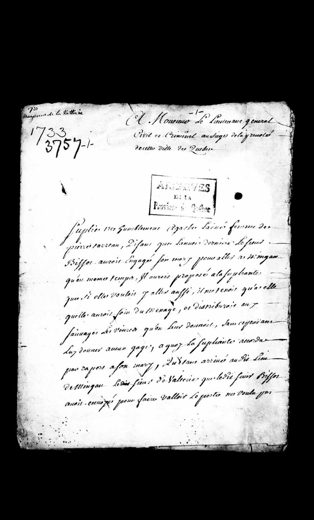 Requête de Agathe Laîné, femme de Pierre Tareau, à l'effet que le sieur Margane de Lavaltrie (Lavalterie) l'aurait constamment persécutée pour l'obtention de faveurs sexuelles, sans succès, et aurait publié des calomnies au sujet de la suppliante; demandant l'assignation dudit sieur de Lavaltrie, pour réparation d'honneur et pour qu'il lui soit fait défense de publier de telles calomnies, 13 août 1733, Archives nationales à Québec, Collection Pièces judiciaires et notariales, (03Q,TL5,D3757).