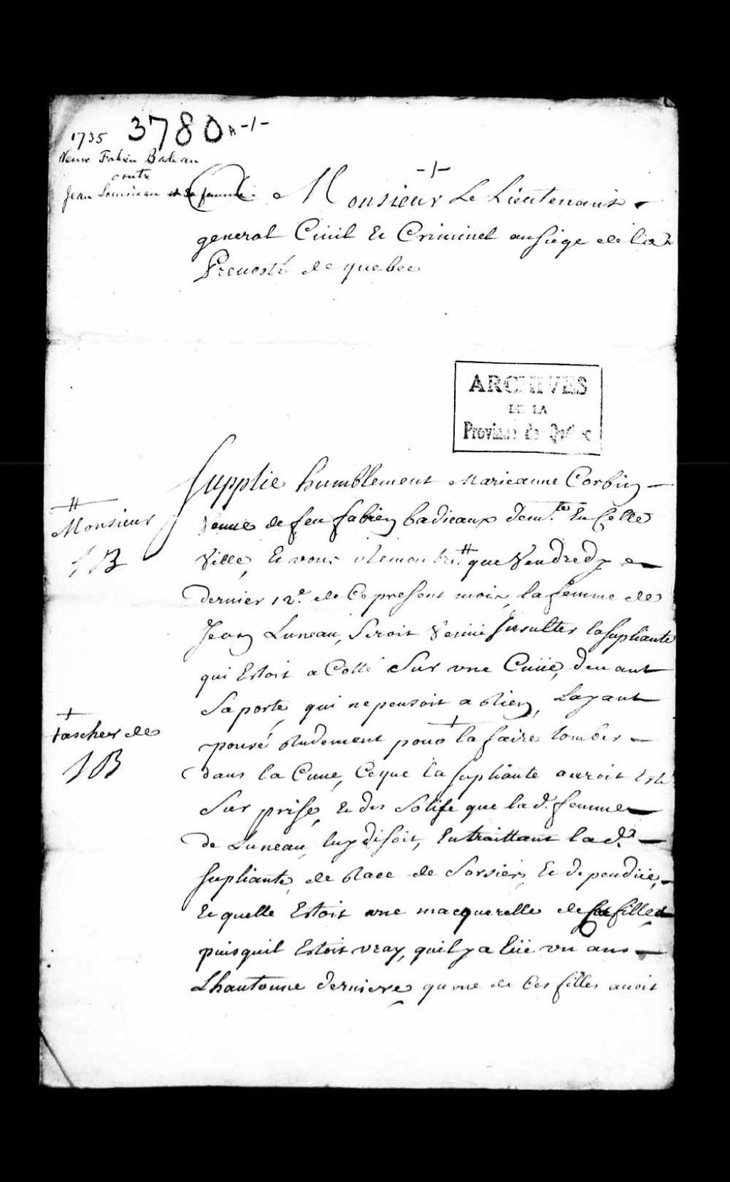 - Requête de Marie-Anne Corbin, veuve de feu Fabien Badeau, demandant l'assignation de Jean Luneau et sa femme, pour les voir condamnés à faire réparation d'honneur à ladite Corbin et à toute sa famille, et à payer les dépens, dommages et intérêts conséquemment aux insultes et aux coups portés à la suppliante et sa fille
