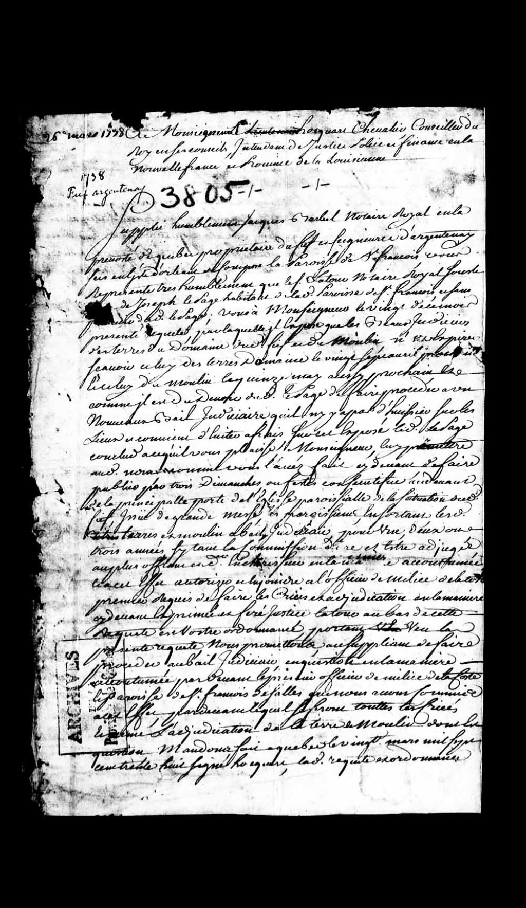 Requête de Jacques Barbel, notaire royal en la Prévôté de Québec, propriétaire du fief et seigneurie d'Argentenay, à l'île d'Orléans, paroisse de Saint-François, s'opposant à l'ordonnance du 20 mars 1738; demandant l'assignation de Joseph Lepage, habitant de la paroisse de Saint-François, pour obtenir l'autorisation de faire procéder au bail judiciaire de la ferme et du moulin du fief d'Argentenay, au siège de la Prévôté de Québec
