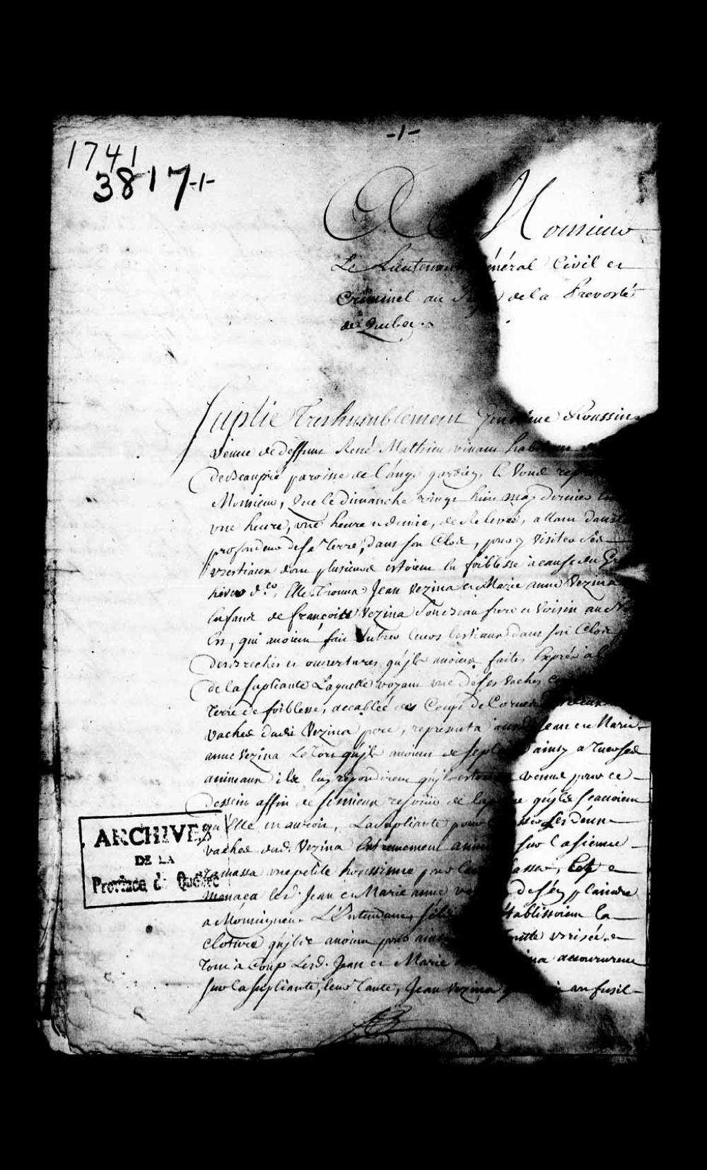 Requête de Geneviève Roussin, veuve de feu René Mathieu, vivant habitant de la côté de Beaupré, paroisse de l'Ange-Gardien, à l'effet que Jean Vézina et Marie-Anne Vézina, enfants de François Vézina, son beau-frère et voisin, auraient volontairement brisé la clôture de la suppliante, laissant entrer deux vaches dudit suppliant dans son enclos, blessant une des vaches de la suppliante; lesdits Vézina auraient également maltraité la suppliante, la blessant gravement; demandant que soit déposé au greffe, par le sieur Cazeau, chirurgien, le certificat de santé de la suppliante; demandant également de demeurer sous la protection des gardes du Roi et, l'autorisation de porter plainte devant le Conseil supérieur de Québec