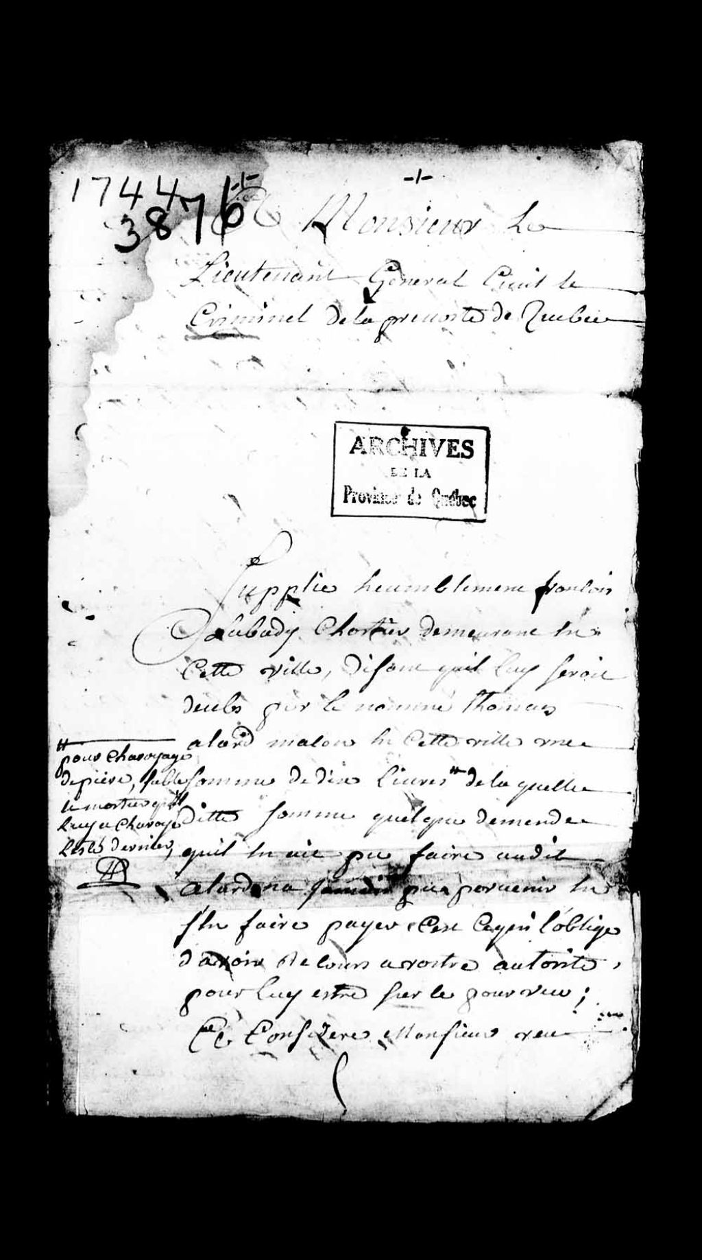 Requête de François Labadie, charretier, demeurant à Québec, contre Thomas Allard, maçon de Québec, concernant une dette de 10 livres pour voyages de pierres et de mortier; demandant autorisation de saisir les arrêts conservatoires entre les mains de Pierre Montreuil, boucher de Québec, débiteur dudit Allard, pour sûreté de son dû, tant principal que relatif aux frais et dépens; demandant également l'assignation du nommé Allard pour ordonner la saisie bonne et valable, 11 décembre 1744, Archives nationales à Québec, Collection Pièces judiciaires et notariales, (03Q,TL5,D3876).