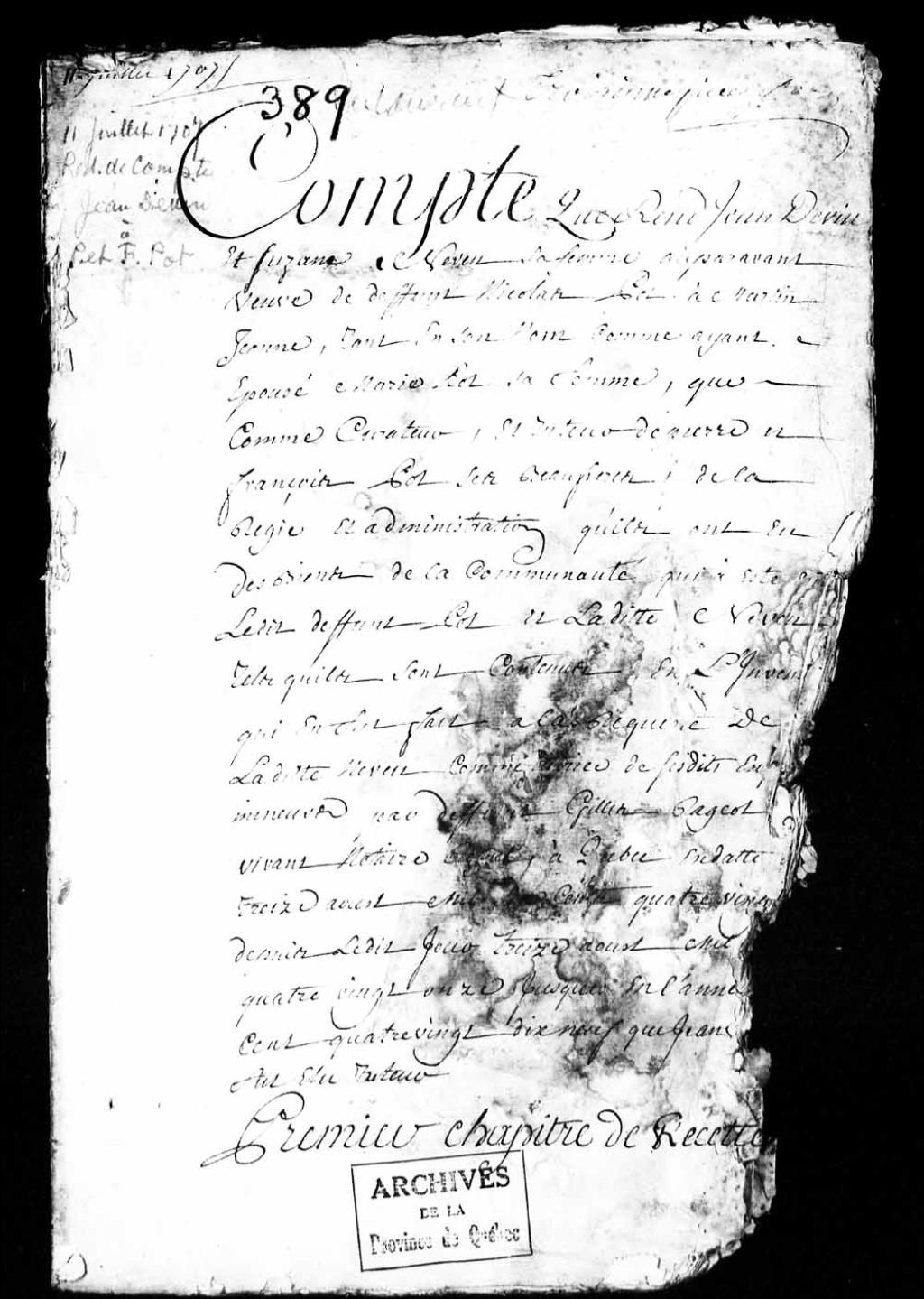 - Reddition de comptes par Jean Devin et Jeanne Neveu, sa femme (auparavant veuve de Nicolas Pot), à Martin Jeanne, tant en son nom comme ayant épousé Marie Pot sa femme, que comme curateur et tuteur de Pierre et François Pot ses beaux-frères.