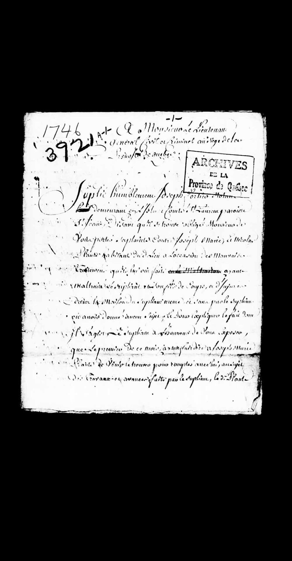 - Requête de Joseph Fortier, notaire, demeurant à l'île et comté de Saint-Laurent, paroisse Saint-Jean, contre Joseph-Marie Plante et Nicolas Plante, habitants dudit lieu, pour voies de fait, mauvais traitements et insultes; demandant acte de sa plainte, et l'assignation desdits Plante pour qu'ils soient condamnés aux dépens, dommages et intérêts