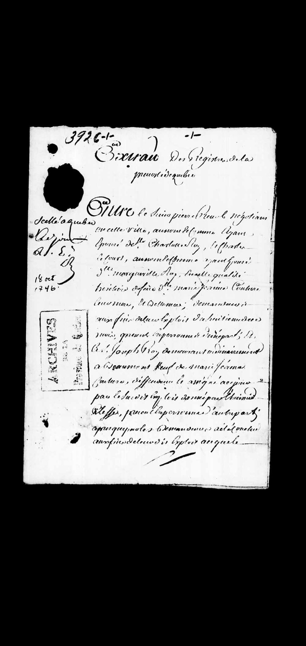 Dossier en matières civiles reçu par la Prévôté de Québec. Ce dossier comprend la requête de Joseph Roy, et un extrait de la sentence rendue en la prévôté de Québec le 18 octobre 1746