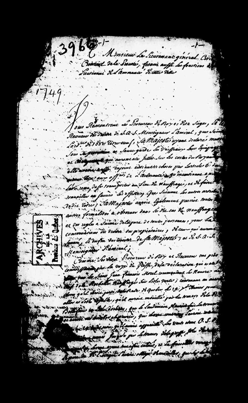 Remontrance du procureur du Roi, et receveur des droits de S.A.S. Monseigneur l'amiral, à l'effet que suivant l'ordonnance de 1681, titre 9, concernant la sauvegarde et la protection des vaisseaux, de leur équipage et chargement sur les côtes du Royaume de France, le lieutenant général de la Prévôté de Québec doit se transporter sur les lieux du naufrage pour satisfaire à la dite ordonnance et évaluer la situation du navire «le Cerf de La Rochelle», commandé par Jean-François Morel, naufragé sur l'Île Verte (l'Isle-Verte); demandant de faire publier et autoriser toute personne qui voudra faire la meilleure condition à Sa Majesté, d'aller au sauvetage des effets de la cargaison dudit navire