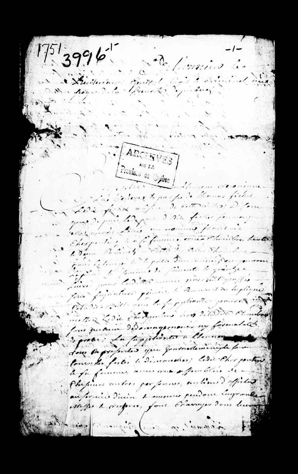 Requête de Véronique Laverrière, épouse de Thomas Fichet, aubergiste absent de cette ville, à l'effet que, depuis le départ dudit Fichet, elle aurait loué au nommé François Charpentier et à son épouse une chambre haute et un cabinet, pour le temps et l'espace d'une année, moyennant la somme de 75 livres, par bail passé par signature privée; ledit bail stipulant que la suppliante se réserve le droit de mettre fin à la location et ce, sans aucun dommages, ni formalité de procès; et que lesdits Charpentier n'assisteraient pas au service du dimanche, mais feraient plutôt de grandes fêtes, ce qui nuit au commerce de la suppliante; demandant l'assignation dudit François Charpentier pour que, nonobstant le bail passé, il soit ordonné de quitter les lieux et condamné aux dépens