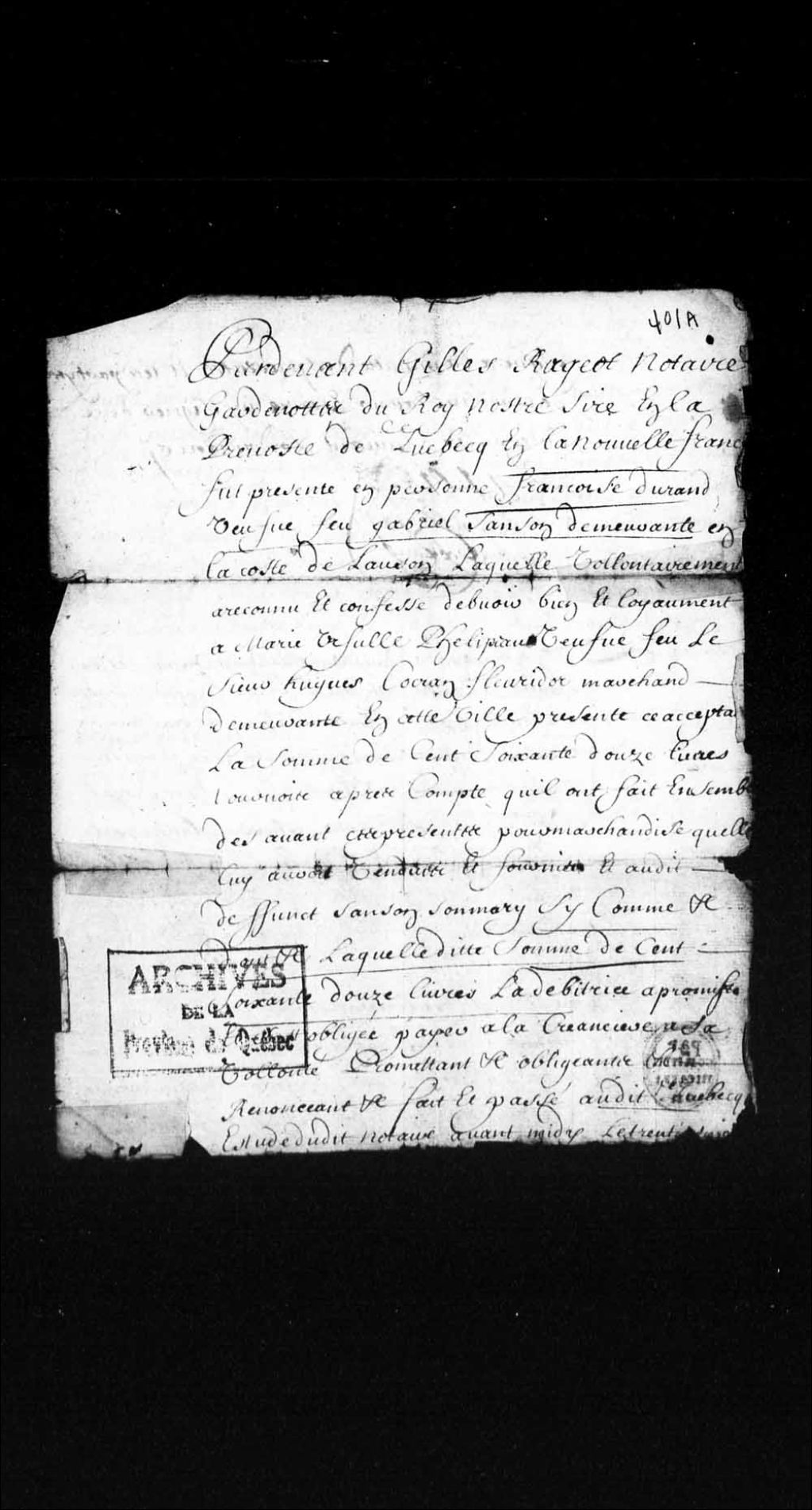 - Ce dossier en matières civiles provient de la Prévôté de Québec et du Conseil supérieur de Québec.Il comprend une obligation de Françoise Durand, veuve Gabriel Samson, demeurant à la côte de Lauzon, à Marie Ursule Phelippeaux, veuve de sieur Hugues Cochran Floridor (Fleuridor), marchand de Québec (acte de Gilles Rageot, notaire en la Prévôté de Québec, 30 juillet 1690); un jugement rendu à la Prévôté de Québec, le 9 février 1694 entre Marguerite Amiot, veuve de défunt Jean Joly, boulanger de Québec et Françoise Durand, veuve Gabriel Samson, habitant de la seigneurie de Vincenne; un compte entre la veuve Samson et la veuve Joly; un mémoire de frais du huissier Le Pailleur (Lepailleur) contre la veuve Samson; une cession et transport par la veuve Joly au sieur Pierre Normandin, de Québec (acte de Louis Chambalon, notaire royal en la Prévôté de Québec, 7 février 1705); un jugement rendu à la Prévôté de Québec, le 21 juillet 1705, entre Pierre Normandin Sauvage, marchand de Québec, au nom et comme ayant les droits de Marguerite Amiot, veuve Joly contre Jean Richard, habitant de la seigneurie de Vincenne, comme ayant épousé Françoise Durand; un état des articles pour madame Joly passé au compte de monsieur Duplessis; des requêtes adressées au Conseil supérieur de Québec par la veuve Joly; des exploits d'assignation; une ordonnance de l'Intendant intervenue sur une contestation entre Françoise Durand, veuve Samson et le sieur Duplessis; une cession et transport du sieur Pierre Normandin, marchand à maître Georges Renard Duplessis (acte de Louis Chambalon, notaire royal en la Prévôté de Québec, 28 juin 1706); des ordonnances de la Prévôté de Québec, intervenues entre le sieur Duplessis et la veuve Joly; une cession et transport par la veuve Floridor à Michel Cureux, sieur de Saint-Germain, aubergiste de Québec; une sentence d'adjudication de l'habitation de la veuve de Gabriel Samson, par le sieur Duplessis; des mémoires de frais et une déclaration des dépens; un inventaire des pièces produites par Pierre Normandin devant le Conseil supérieur