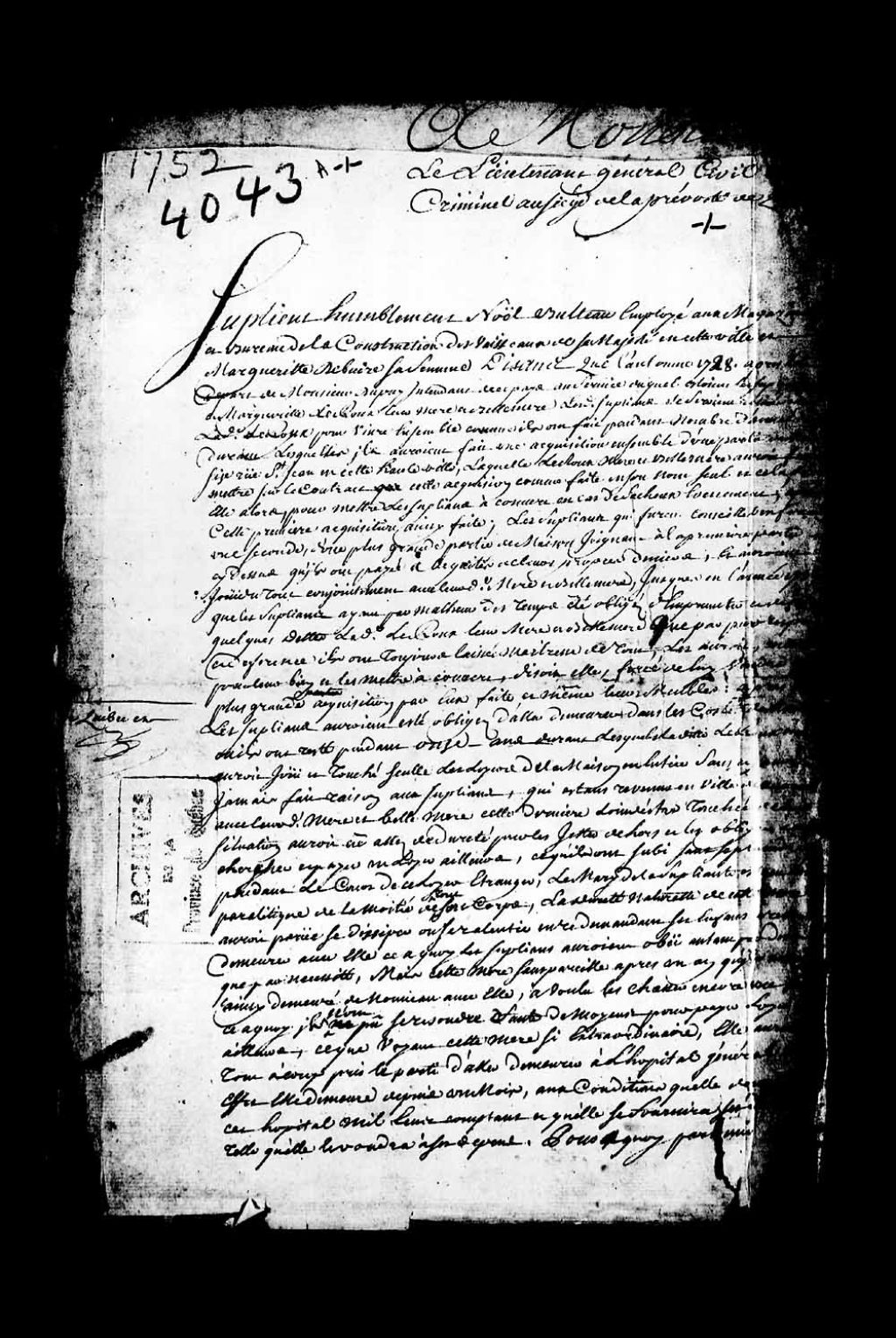 Requête de Noël Bulteau (Bluteau), employé au magazine et bureau de la construction des vaisseaux de Sa Majesté à Québec, et Marguerite Debuire, son épouse, à l'effet qu'aucun inventaire n'a été fait de la communauté entre Marguerite Leuroux et feu Jean Gabriel Debuire, son mari, père et beau-père des suppliants, et que la dite veuve Debuire est en train de liquider par licitation les biens et immeubles de la succession de feu son mari; demandant l'assignation de ladite Leuroux pour qu'elle soit condamnée à rendre compte aux suppliants de la gestion et administration de la communauté, et à payer à la suppliante le reliquat et les dommages, dépens et intérêts, 5 mai 1752 - 9 mai 1752, Archives nationales à Québec, Collection Pièces judiciaires et notariales, (03Q,TL5,D4043).
