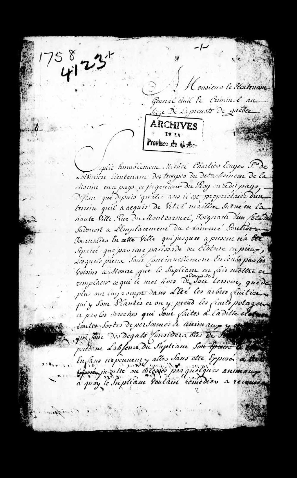 Requête de Michel Chartier, écuyer et sieur de Lotbinière, lieutenant des troupes du détachement de la Marine et ingénieur du Roi, à l'effet que par contrat de vente fait avec Vital Maillou (Mailloux), il serait propriétaire d'un terrain situé en la Haute-Ville, rue du Mont-Carmel (Montcarmel), joignant l'emplacement du nommé Pouliot, journalier à Québec, qui ne cesserait de faire des brèches dans la palissade séparant les deux propriétés; demandant l'assignation dudit Pouliot pour qu'il soit condamné à contribuer de moitié à un mur de clôture et de séparation des terrains des deux parties, tant par la cession d'une partie de terrain, que par les frais associés à ladite construction, 10 mai 1758, Archives nationales à Québec, Collection Pièces judiciaires et notariales, (03Q,TL5,D4123).