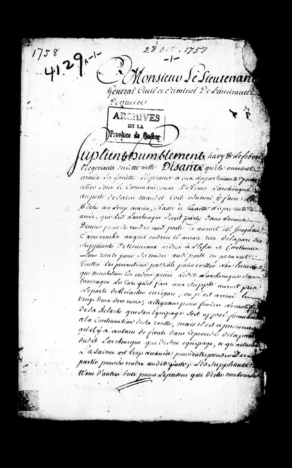 Requête de Havy et Lefebvre, négociants à Québec, à l'effet qu'il aurait fait certains paiements et avancées de fournitures aux membres de l'équipage de la goélette «L'Espérance», commandée par Denis Larchevêque (Larchevesque), capitaine, pour aller au poste Saint-Maudet; demandant l'assignation de Jean-Baptiste Hallé, second, Jean Guillard, maître d'équipage, Denis Couillard, Prisq Bacon (Prisque Bacon), Jean Dabouville et Louis Bournois pour qu'ils soient condamnés à rembourser et payer au suppliant les sommes par eux reçues d'avance, à moins qu'ils ne s'engagent à poursuivre et compléter ledit voyage, 28 octobre 1758, Archives nationales à Québec, Collection Pièces judiciaires et notariales, (03Q,TL5,D4129).