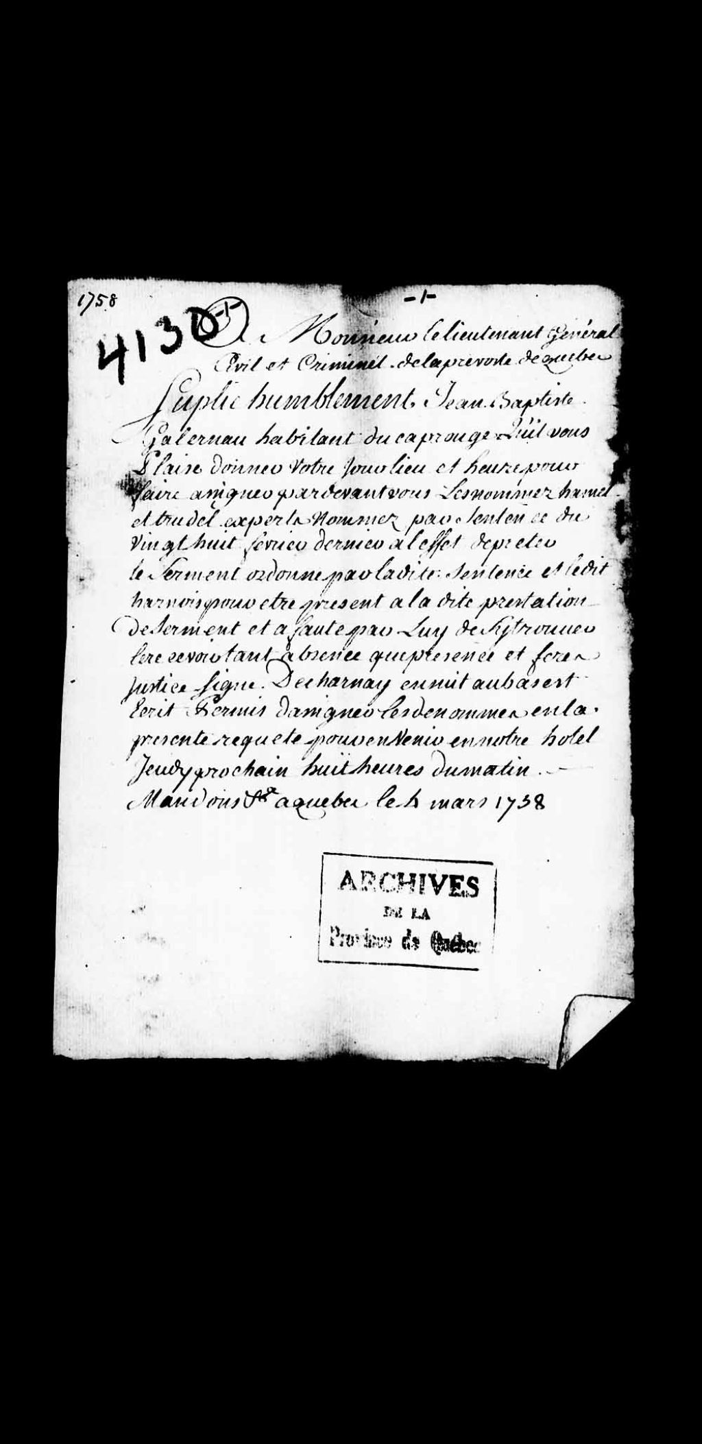 Requête de Jean-Baptiste Galarneau (Galerneau), habitant du Cap-Rouge, demandant l'assignation des sieurs Hamel et Trudel, experts nommés par sentence du 28 février 1758, pour procéder à leur assermentation, 4 mars 1758, Archives nationales à Québec, Collection Pièces judiciaires et notariales, (03Q,TL5,D4130).