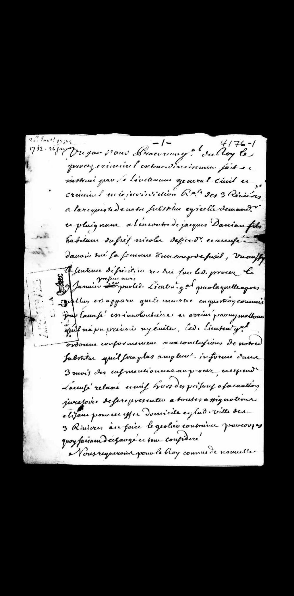 Conclusions du procureur général du Roi au Conseil supérieur de Québec, Louis-Guillaume Verrier, pour l'appel aminima de la sentence du 19 janvier 1732, rendue dans le cadre du procès criminel extraordinairement fait et instruit par le lieutenant général civil et criminel de la Juridiction royale des Trois-Rivières, à l'encontre de Jacques Daniau, fils, habitant le fief Nicolet, accusé d'avoir tué sa femme d'un coup de fusil et relâché de prison pour avoir commis un meurtre involontaire et «arrivé par malheur qu'il n'a pas pu prévoir», 26 janvier 1732, Archives nationales à Québec, Collection Pièces judiciaires et notariales, (03Q,TL5,D4176-1).