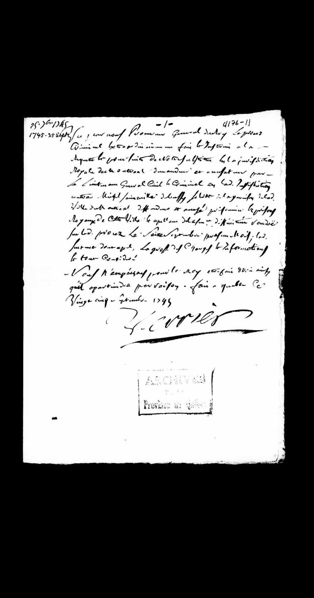 Conclusions du procureur général du Roi au Conseil supérieur de Québec, Louis-Guillaume Verrier, sur l'appel de la sentence du 16 septembre 1745, rendue dans le cadre du procès criminel extraordinairement fait en la Juridiction royale de Montréal, contre Michel Saineville (Senneville) DeBussy, soldat de la garnison de ladite ville de Montréal, accusé d'avoir fabriqué des ordonnances (monnaie) signées Hocquart, appelant