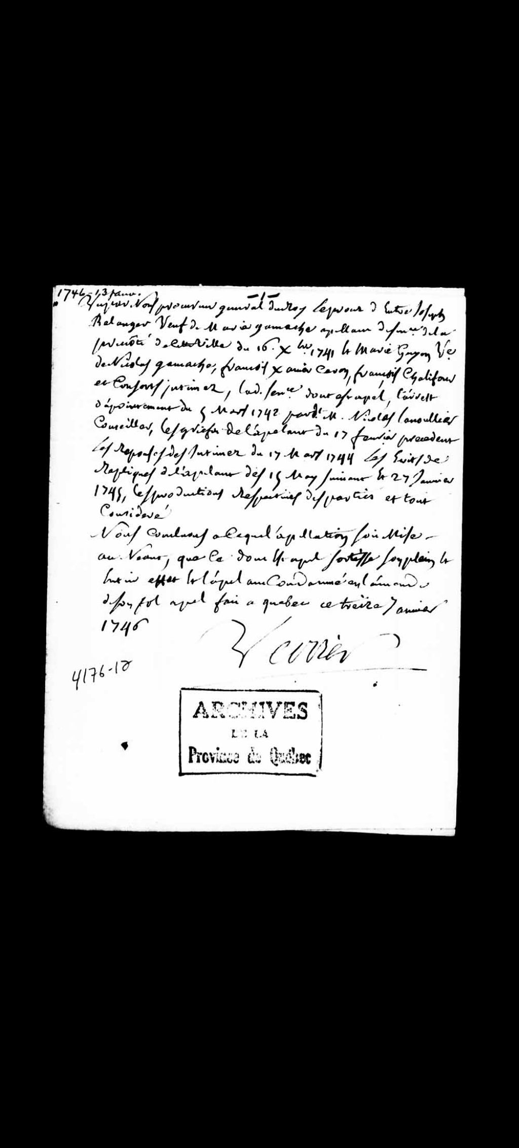 Conclusions du procureur général du Roi au Conseil supérieur de Québec, Louis-Guillaume Verrier, dans le procès entre Joseph Bélanger, veuf de Marie Gamache, appelant de la sentence de la Prévôté de Québec du 16 décembre 1741, et Marie Guyon, veuve de Nicolas Gamache, Xavier Caron et François Chalifour et consorts